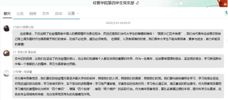 本网讯 3月19日,经管学院学生第四党支部召开线上主题党日活动,组织学生党员集中学习了《习近平给在首钢医院实习的西藏大学医学院学生重要回信》《习近平给北京大学援鄂医疗队全体“90后”党员的回信》以及《用生命践行使命——施咏康同志先进事迹》,并进行了学习交流研讨。