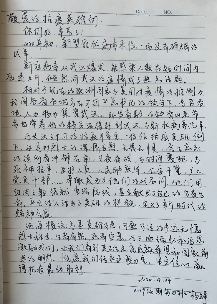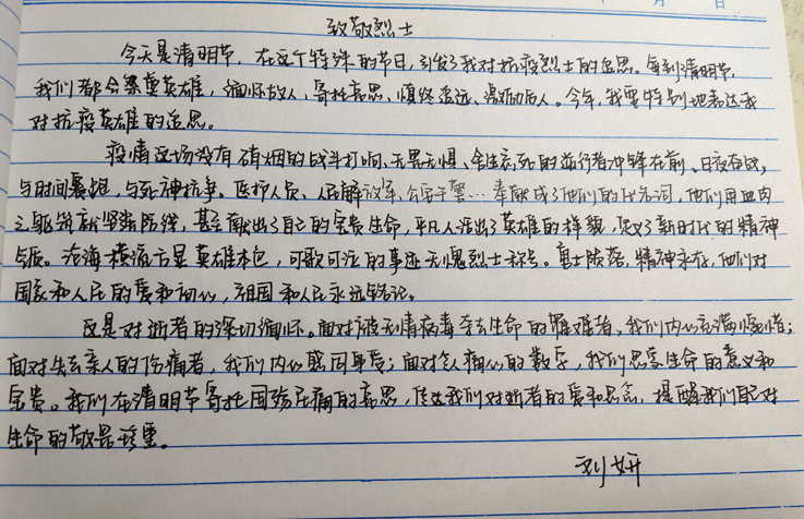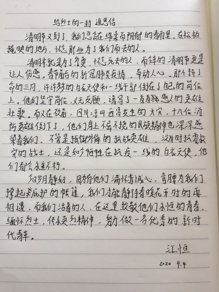 为抒发对英烈的崇敬与感恩之情,继承发扬清明节传统的追思习俗,经管学子们以手写追思信的方式表达自己的感恩与缅怀之情。一封封情真意切、平实质朴的书信,不仅表达了同学们的敬仰与追思之情,更表明了致敬英烈、勇于传承的信念与信心。