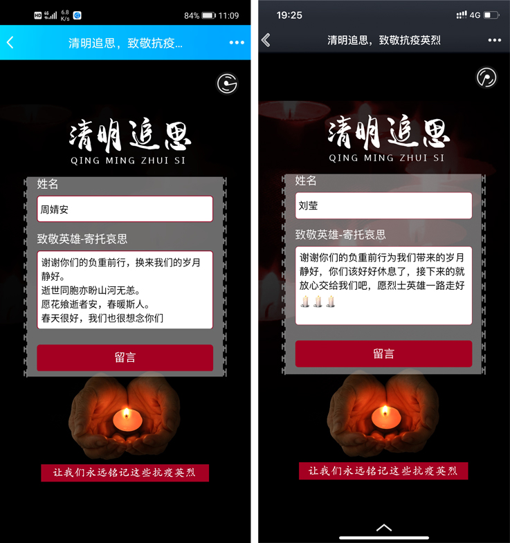 本网讯 4月4日,全国举行哀悼活动,深切缅怀新冠肺炎疫情中牺牲烈士和逝世同胞,向烈士致敬,为逝者默哀。为悼念革命烈士,继承弘扬革命先烈优秀品质,弘扬民族精神,经管学院开展主题为“缅怀·追思·传承”的线上主题团日活动。经管学子通过自己的方式,抒发对英烈的崇敬与感恩之情。