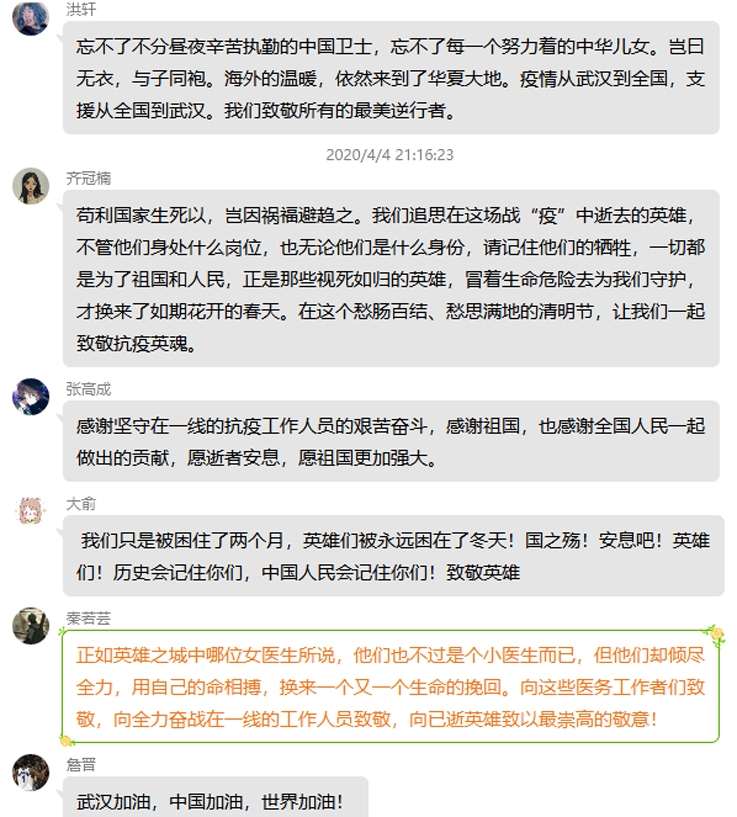 在团支书的带领下,团员青年们共同学习了董存瑞、刘胡兰、焦裕禄等革命先烈的英雄事迹,后回顾了近代史上无数为拯救中华于危难之中的革命先烈,到如今在抗击疫情过程中涌现出的无数伟大的逆行者们。同学们纷纷发表自己的感言寄语,以此寄托哀思:他们的人生是那样短暂,然而价值却是那般宝贵;他们或是儿女、爱人、父母……但更是英雄!他们将躯体献给祖国人民,象征着民族精神的熠熠光辉永照后人,鼓舞着我们这一代知识青年为振兴中华奋勇前进!他们用鲜血和生命所创造的精神已经深入人们的心灵,变成亿万人民的宝贵财富……