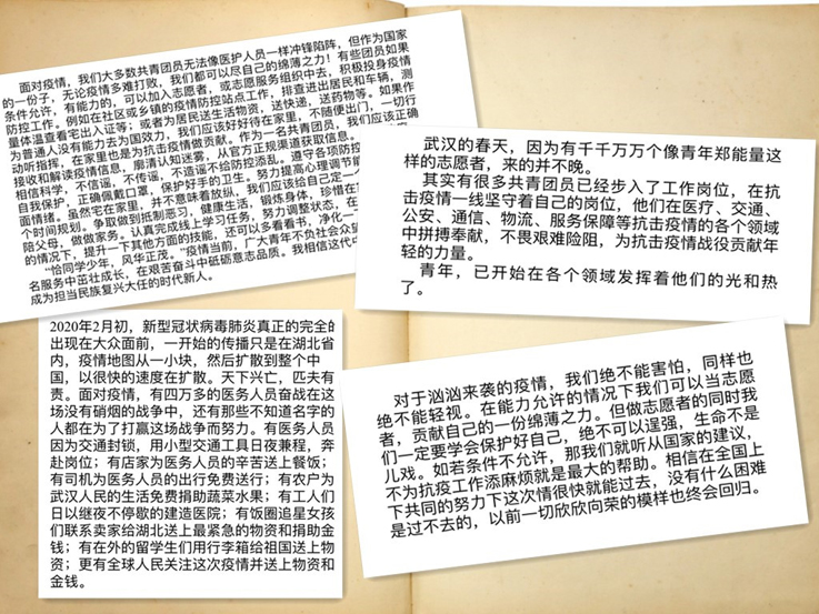 金三人老师带领团员青年共同学习了3月15日习近平总书记给北京大学援鄂医疗队全体“90后”的回信精神,分享了援助武汉的医护人员和青年志愿者的具体事迹,呼吁全体团员与祖国“共呼吸、同命运”,肩负起青年的使命、义务、责任和担当,并要求团员们在战“疫”中树立正确的世界观、人生观、价值观。