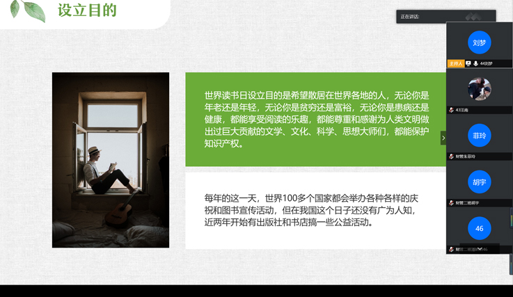 活动首先为大家介绍了世界读书日的来源、目的及意义,并向大家普及了世界各地庆祝读书日的方式,使同学们加深对世界读书日的了解与体会。其次,活动向大家介绍了读书的意义以及优秀书籍作品和作家,希望鼓励大家能够养成终身阅读的好习惯,尊重和感谢为人类文化文明做出过巨大贡献的文学大师们。