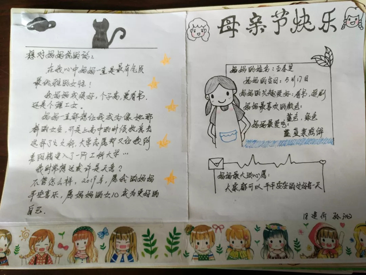 在这个环节中,同学们要用文字或绘画制作亲情档案,记录自己对母亲喜好、心愿的了解,或和母亲生活的点滴小事,或想对母亲说的话。在亲情档案中,字里行间都体现着同学们对母亲的感恩之情。记忆中的母亲的模样总是亲切温柔,同学们的作品也流露出浓浓的深情。