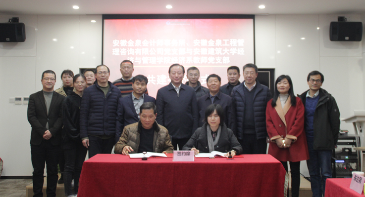 本网讯 12月9日,ku游官方经济与管理学院经济系党支部与安徽金泉会计师事务所、安徽金泉工程管理咨询有限公司党支部共建签约仪式在安徽金泉会计师事务所举行。学校党委常委、副校长蔡新立率领科技处、经管学院负责人、支部老师出席支部共建签约仪式。