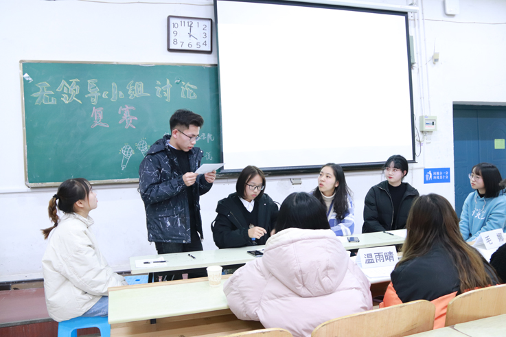 复赛在北区A107教室举办,24位晋级选手分为4组进行无领导小组讨论比赛,选手们对讨论题目进行了个人观点表述,组内讨论和小组观点总结。现场气氛活跃,小组成员发言踊跃,掀起一股思维的对撞和语言的对抗。