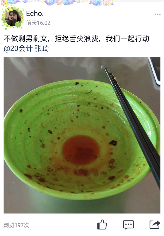 本网讯 为大力弘扬中华民族优良传统,增强学生勤俭节约意识,经管学院于近日开展“光盘行动”打卡接力活动,取得良好效果。