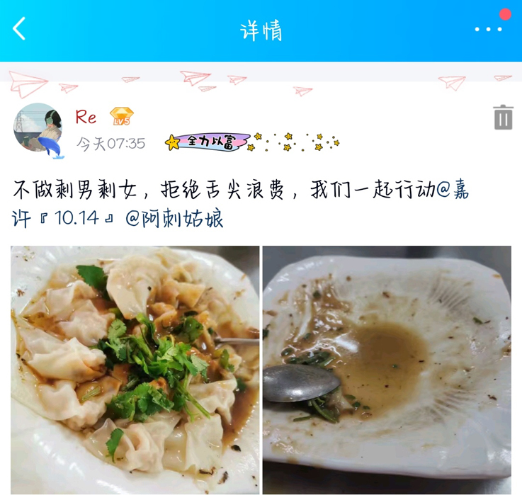 本次活动采取线上线下相结合的方式进行,线下组织学生设计主题海报,并张贴于南、北食堂进行广泛宣传动员,线上收集同学们的光盘打卡照片,同时配文“不做剩男剩女,拒绝舌尖浪费”并@好友进行光盘打卡接力,有效增强了活动的参与度与影响力。活动中,同学们积极参与,纷纷表示今后会从自身做起,厉行勤俭节约,反对铺张浪费。