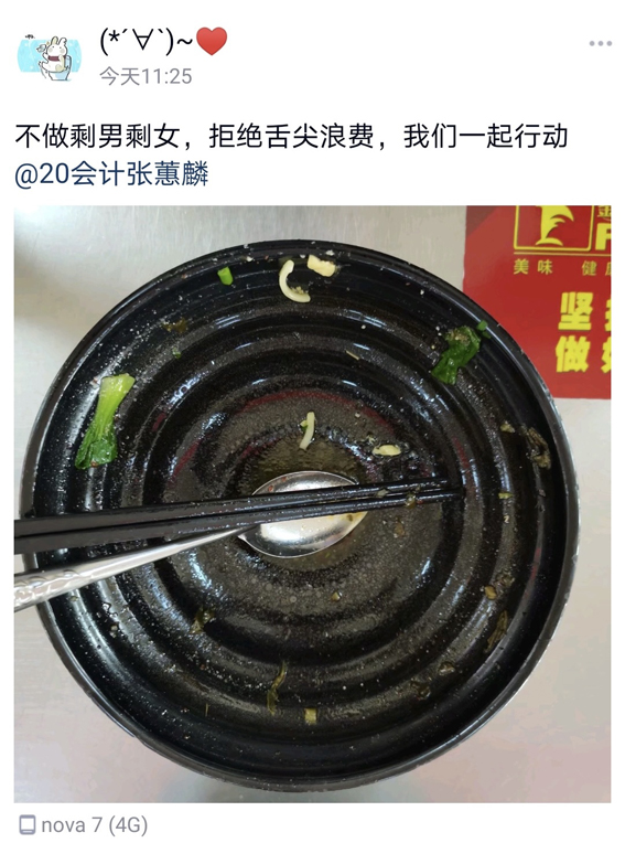 本网讯 为大力弘扬中华民族优良传统,增强学生勤俭节约意识,经管学院于近日开展“光盘行动”打卡接力活动,取得良好效果。