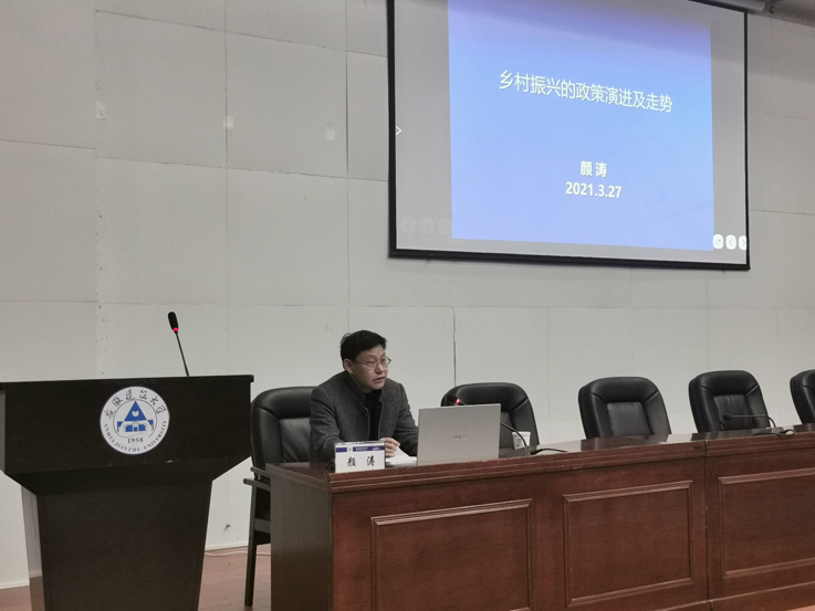 安徽省扶贫办综合处处长颜涛以《乡村振兴的政策演进及走势》为主题,从什么要进行乡村振兴、农村改革发展历程对推进乡村振兴的启示、脱贫攻坚伟大成就对推进乡村振兴的启示、乡村振兴政策体系架构四个方面,系统阐述了乡村振兴的政策演进及走势。报告既有理论高度又贴近现实,启发同学们的研究思路,引起大家强烈共鸣。