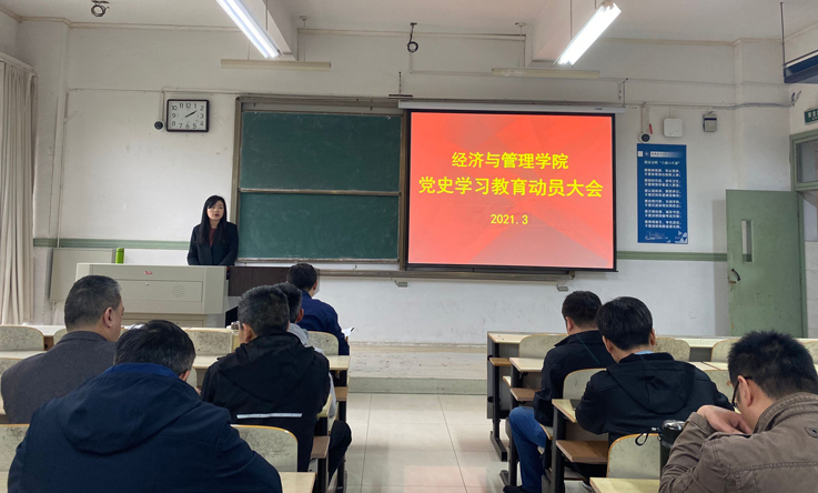 本网讯 3月31日,经管学院在主教学楼1209教室召开党史学习教育动员会,传达学习校党委书记方潜生同志在学校党史教育动员大会上讲话精神,布置学院党史学习教育安排。学院全体党员教师和学生党员代表参加了大会。