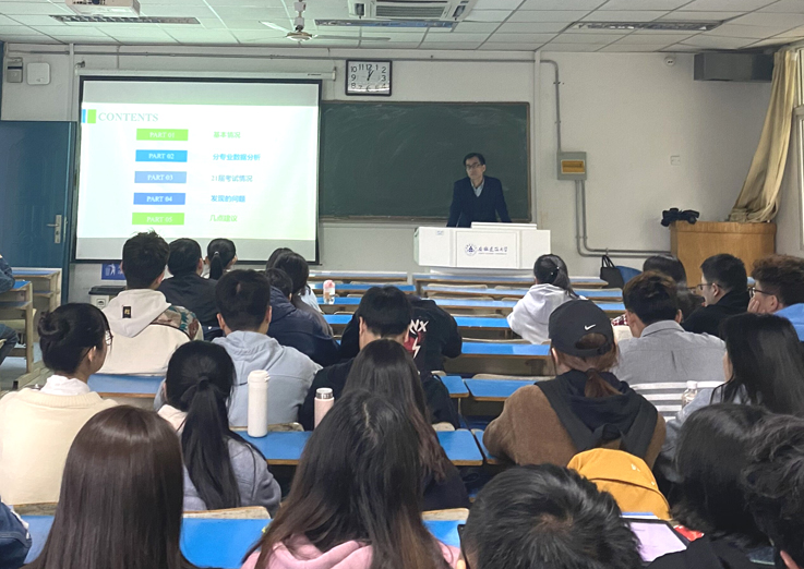 会前,学院对近三年各专业学生考研数据进行了梳理,形成了最新的考研形势分析报告,报告从各专业报考和录取数据入手,分析了往届学生在考研过程中取得的成效和暴露问题与短板。勉励2018级同学既不好高骛远,也不妄自菲薄,在总结前人经验教训基础上,合理自我评估和定位、夯实公共课基础、报考合适的院校和专业、把握调剂机会,坚定信心、持之以恒,争取在2022年研究生考试中取得理想成绩。