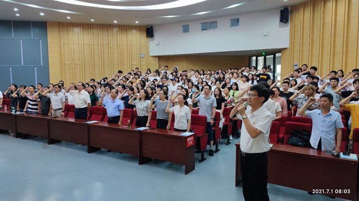 庆典开始前,全体党员在陈国中书记的带领下重温入党誓词,面向鲜红的中国共产党党旗,铿锵有力的宣誓声响彻大厅。
