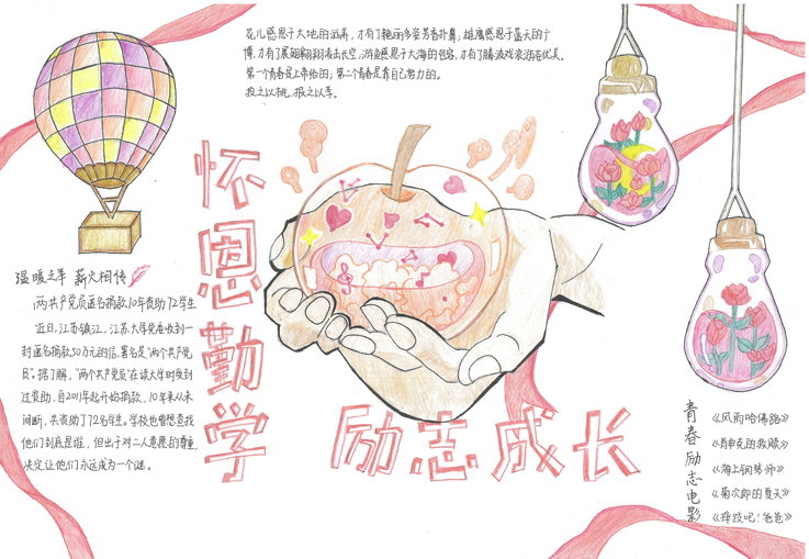 本次资助主题手抄报设计活动以“虹恩莫忘,立志成才”为主题,受到广大经管学子的热烈响应,大家踊跃报名、精心准备。同学们结合国家资助政策,用画笔表达对国家资助政策的无限感恩之情,进一步深化资助育人内涵,引导广大学生心怀感恩、拼搏进取。