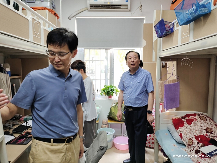 蔡新立首先走访了北区学生宿舍,检查学生宿舍环境,了解他们的思想动态,勉励他们尽快适应新环境,启航新征程。随后,他考察了学院新近搬迁的F南楼办公区,对学院搬迁工作进行指导,并就新学年相关工作与学院领导班子成员亲切座谈。