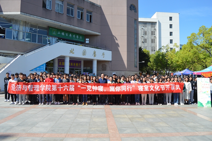 本网讯 10月12日,经管学院第十六届寝室文化节开幕式在北区食堂门口广场举行,这次活动的主题是—“一见钟寝,寓你同行”,学院领导老师亲临现场,并与同学们合影留念。