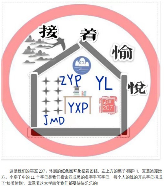 同学们设计的门牌中既包含“春秋早晚,岁岁欢愉”的平凡期望,也蕴藏着“金鳞岂是池中物,一遇风雨便化龙”的鸿鹄之志。9#218的四位女生更是通过奇思妙想,将“218”三个数字结合成一个“未”字,不仅巧妙地将门牌号融入其中,也同时展现了当代大学生朝气蓬勃的精神风貌。