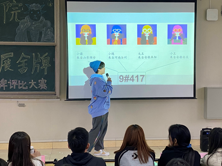 比赛中,九个参赛寝室分别派出代表上台,通过演说PPT的方式向评委和观众展示自己的设计,进一步阐述门牌的设计理念和蕴含的情感。内容丰富,色彩多样的PPT记录了同学们日常生活中的美好,展现了积极进取的精神,获得了观众的热烈掌声。