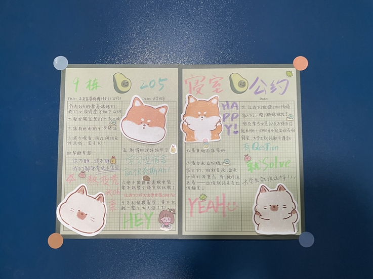 入围决赛的寝室各具特色和亮点,每一扇房门的背后都凝结着同学们的用心和创意。一幅幅手绘创作的寝室公约,一盆盆精心栽培的绿植和鲜花,一张张笑容满面的合影照片,无一不体现着寝室文化的内涵和美好生活的点点滴滴。其中9#218寝室以星空为主题,走廊中央挂着的小彩灯宛如夜空中的小星星,点缀了整个寝室,同学们还演唱了歌曲《夜空中最亮的星》,更与寝室的主题相呼应,营造出温馨浪漫的氛围。期间老师与各寝室的同学们亲切交流,充分了解了同学们的日常学习生活情况,同时也向同学们表达了自己的祝福与期望。