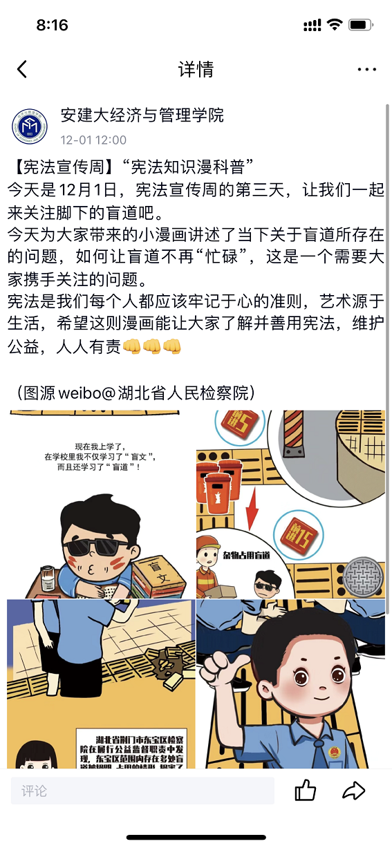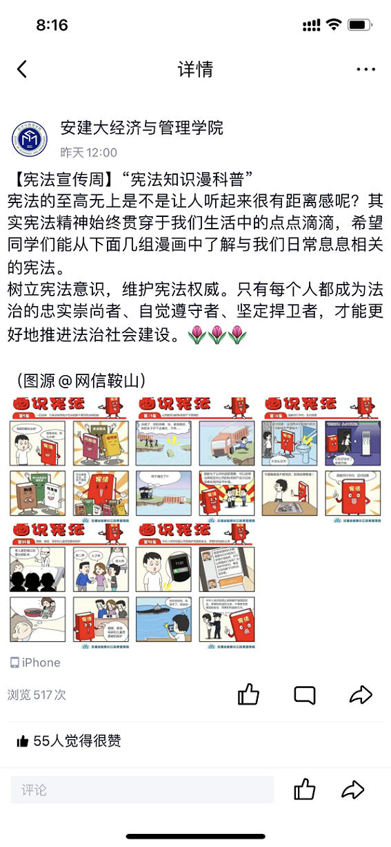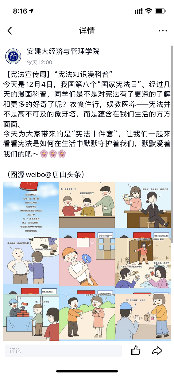 同时,学院通过官方QQ平台进行了“宪法知识漫科普”宣传活动,每天的宪法科普漫画潜移默化,让同学们对宪法与生活的联系有了更多的思考与认识。