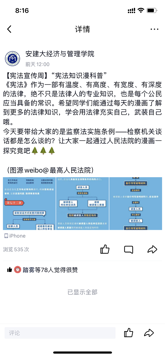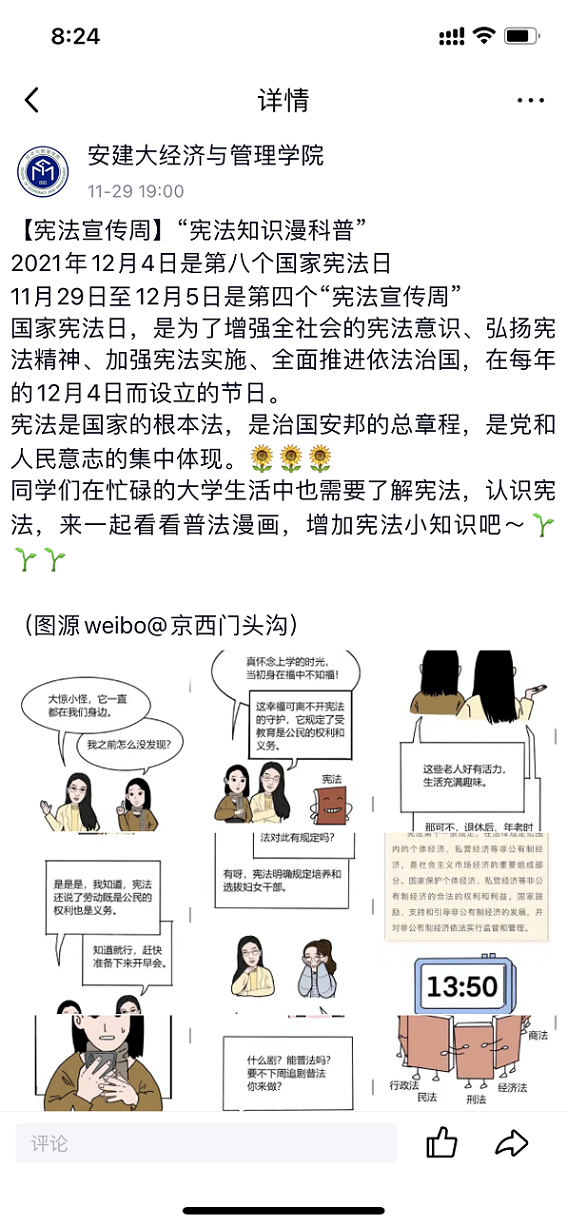 同时,学院通过官方QQ平台进行了“宪法知识漫科普”宣传活动,每天的宪法科普漫画潜移默化,让同学们对宪法与生活的联系有了更多的思考与认识。