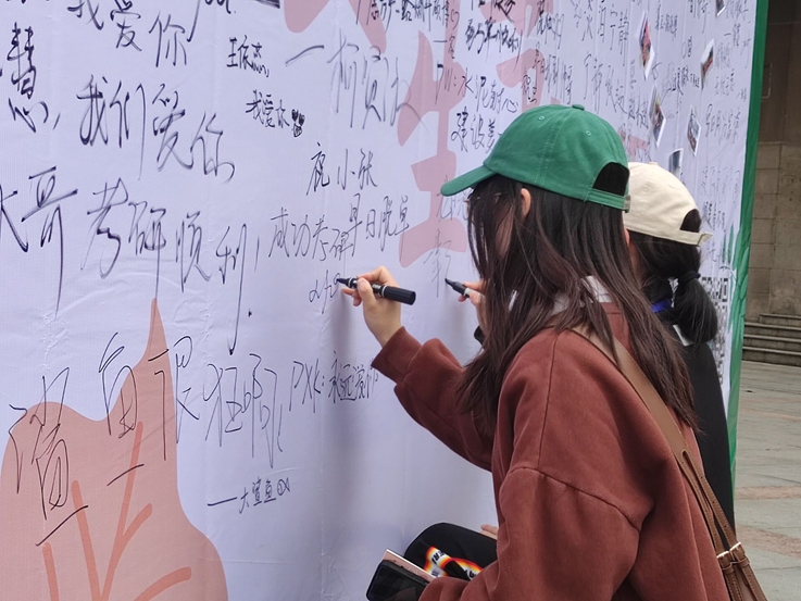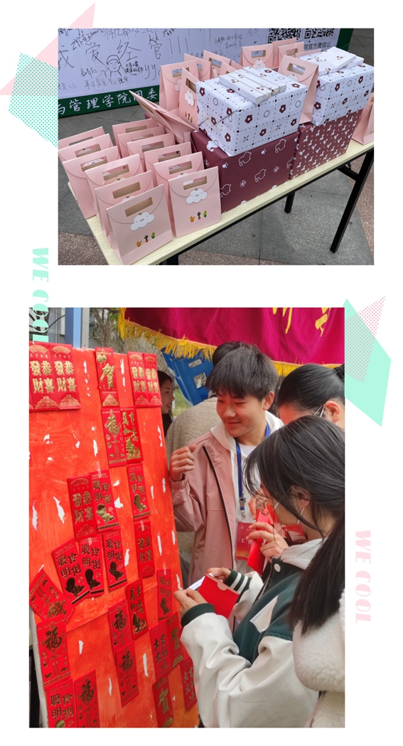 中午时分,参与者陆续到达活动现场,同学们拿起笔,争相在签名墙上留下自己的愿景和祝福,“智者不坠爱河,某某一路硕博”“平平安安,早日脱单”“好好生活,皆如所愿”……或诙谐或真切的话语,让原本平淡的画布因为同学们的字迹变得活泼又热闹,成为校园里一道靓丽的风景线。在活动开始前,学院官Q进行了线上宣传,参与者通过转发集赞获得抽奖机会,现场抽奖与猜谜小游戏同步进行,学生会工作人员在每个红包中都放入了谜语,答对问题就能获得精美小礼品。同学们兴致高昂、跃跃欲试,很快就将所有红包一扫而空。丰富有趣的活动引起了大家的浓厚兴趣,现场气氛火热,吉祥物菁菁和琯琯更是凭借可爱的形象成为开幕式的“顶流”,吸引了无数同学合影留念。