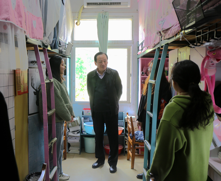 “老家是哪里的啊?”“目前几年级,对未来有什么样的规划?”“住宿和日常生活有没有什么困难?”......蔡新立与女生们亲切交谈,同学们也分享了自己对于考研、就业的未来规划。蔡新立对于同学们的发展规划表示肯定,鼓励大家明确目标、努力奋斗,同时叮嘱同学们增强安全防范意识、养成健康的生活习惯、营造阳光积极的寝室氛围,期待听到大家考研成功的好消息。