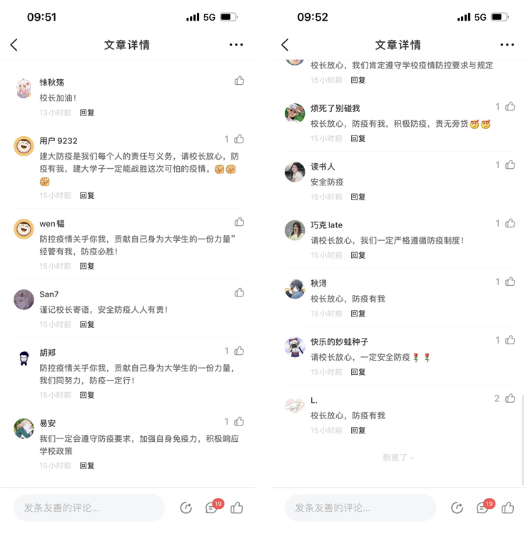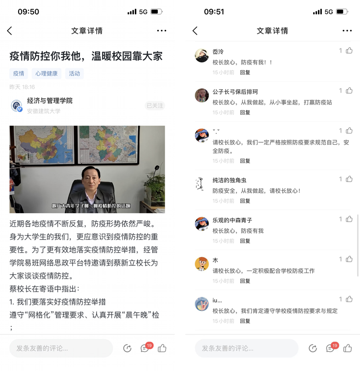 疫情防控、人人有责。蔡新立通过经管学院易班网络思政平台,语重心长地对同学们进行叮咛与嘱咐。视频在易班平台发布后,广大学子纷纷跟帖留言,感谢校领导的关心,表示一定从自身做起,响应学校号召,遵守疫情防控的各项规定,非必要不出校,认真进行“晨午晚”检,主动参加核酸检测,共同守护来之不易的安全成果。