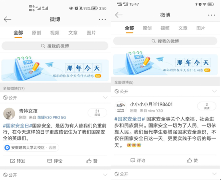 为与线下的主题活动相结合,达到更好的宣传教育效果,学院组织了丰富多彩的线上活动。同学们通过VR全景沉浸式游览、“微博#国家安全日#话题”互动、国家安全日专项答题活动,引导同学们深刻认识当前我国的安全形势,增强同学们自觉保护国家安全、保守国家秘密的动力,使同学们对《国家安全法》《生物安全法》《网络安全法》《国家情报法》《反恐怖法》《保密法》等安全知识有了更深入的了解。
