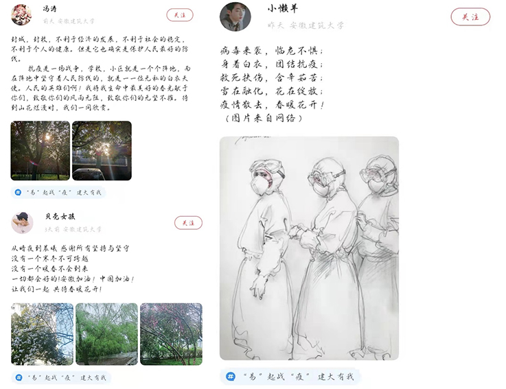 为表达对抗疫的祈愿,对疫情中工作人员的感谢和对家人、老师和朋友的美好祝愿,3月25日,经管学院易班发展中心响应校易班发起“‘易’起战‘疫’,建大有我”线上祈愿活动。本次活动同学们积极相应,有的用文字写下“疫情不能阻挡春天,口罩不会遮住笑脸”来传达对抗疫的信心,必胜的信念;有的用画笔描绘了对医护人员的敬爱和对家人的祝愿,“大白”们神色坚毅,为了同学们的生命安全坚守在抗疫一线;有的用照片记录了疫情防控下温暖点滴和辛苦的工作人员们,漫长的等待和无穷尽的检测迎接的是前方的光明。本次活动旨在为同学们提供一个展露心扉的平台,减少焦虑心理,缓解精神压力。疫情期间响应国家政策做好防疫措施,与奋战在一线的工作人员心手相牵,并肩作战。线上祈愿,静待花开,我们终将战胜疫情寒冬,迎来崭新的春天。