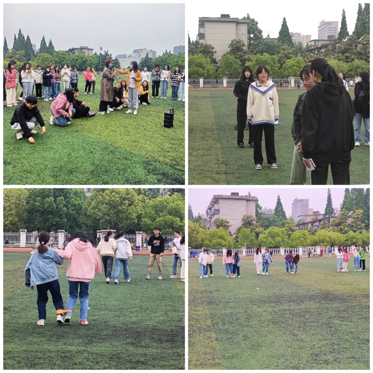 “两人三足”游戏中,两人组成一队后用绳子捆住邻近两人的脚踝,在主持人下令开始的时候跑向目标终点完成五四红图拼图,最先返回起点的队伍获胜。活动一开始,操场上面响起了此起彼伏的“一二、一二......”的口号。同学们也从一开始的小心翼翼到步伐开始逐渐加快。
