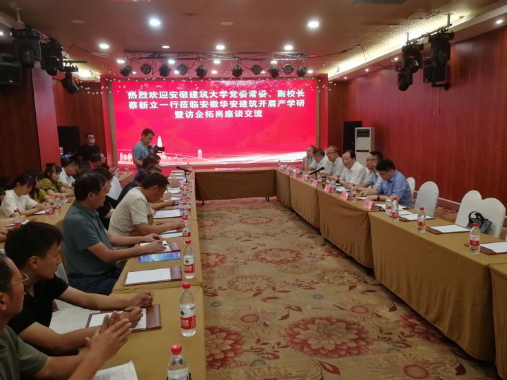 本网讯 8月22日,校党委常委、副校长蔡新立率队赴安徽华安建筑安装工程有限公司开展访企拓岗调研和产学研合作活动,学校宣传部、就业处、科技处、科技成果转化中心、环能学院、经管学院等单位负责同志参加了调研。安徽华安建筑公司董事长成国平、总经理阮洪章携公司中层以上管理人员参加座谈交流。