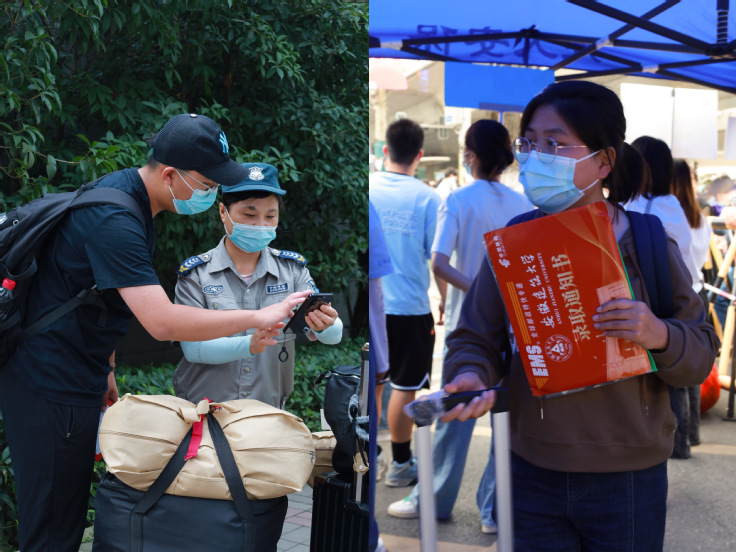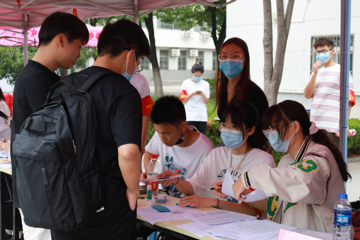学校大门处,新生们依次出示健康码、行程码、核酸检测报告,在进行体温检测后,由志愿者带领到达报到点进行入学登记。
