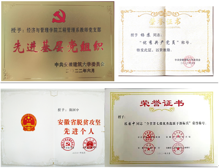在支部建设过程中,党支部坚持把纪律和规矩放在前面,强化纪律约束与监督,严格执行“三会一课”制度、请假制度、党费收缴制度等,确保党员考核规范有序,党员教育管理及时有效。真正做到支部有活动,党员有行动,教学有推动。2016年、2022年先后两次荣获学校“先进基层党组织”荣誉称号;2021年陈国中获安徽省“脱贫攻坚先进个人”、安徽省“第七批优秀选派干部标兵”;2022年杨苏获校“优秀共产党员”称号。