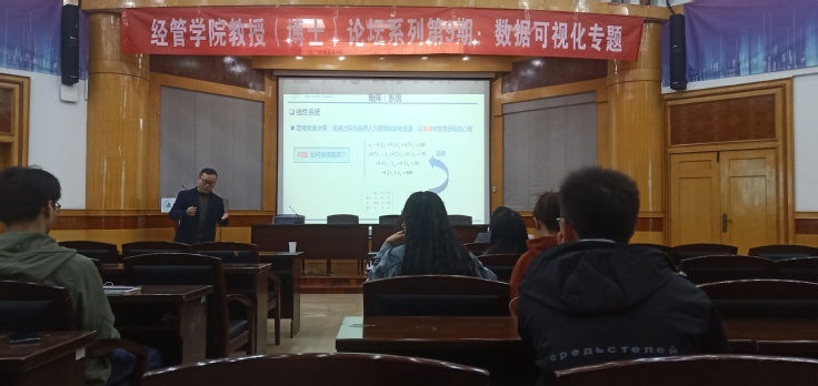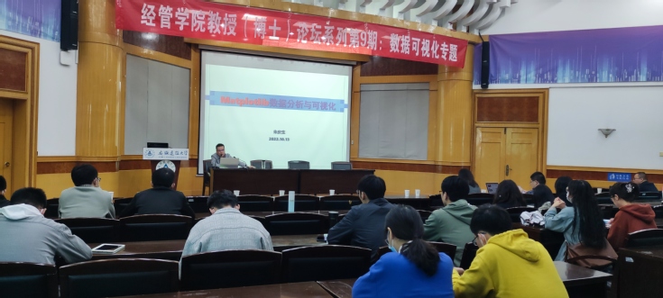 本网讯 10月13日,经管学院在北区F楼三楼报告厅举办“数据可视化”专题论坛。本次论坛由安徽省房地产与住房公积金研究院、ku游官方建筑经济与房地产管理研究中心联合主办。论坛特邀校党委常委、副校长蔡新立教授做主旨报告,学院副教授朱庆生和青年博士马晋超做学术讲座。学院领导班子成员、青年骨干教师、硕士研究生共80余人参加。