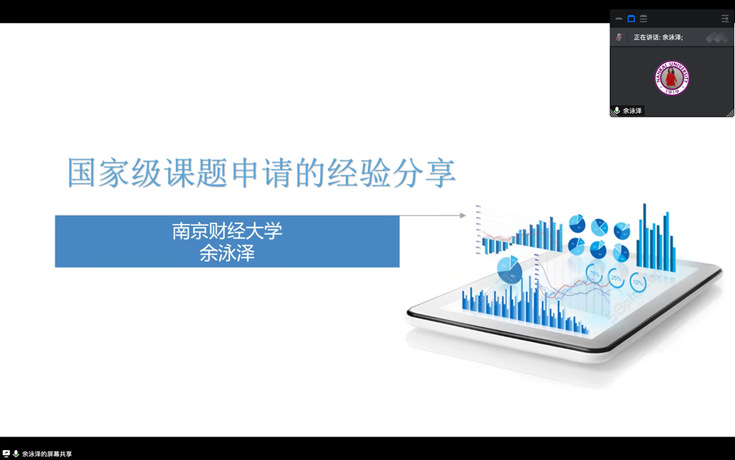 余泳泽教授以“国家级课题申请的经验分享”为题,系统介绍了国家自然科学和国家社会科学基金项目申报侧重点和评审要点,并以个人立项的国家基金项目为例,围绕科学问题属性、关键科学问题、研究目标、研究内容、研究方案等方面逐项介绍了国家基金项目申请书撰写的技巧以及注意事项。