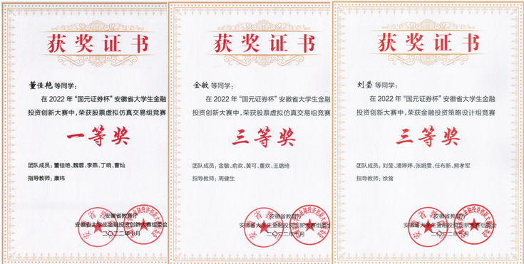 本网讯 近日,我院学子在安徽省教育厅主办的2022年“国元杯”安徽省大学生金融投资创新大赛中再获佳绩。经管学院董佳艳作为队长组建的团队获得省赛一等奖,刘莹、金敏、王冬波、周杨柳、赵梦晗等作为队长组建的团队分别获得省赛三等奖。