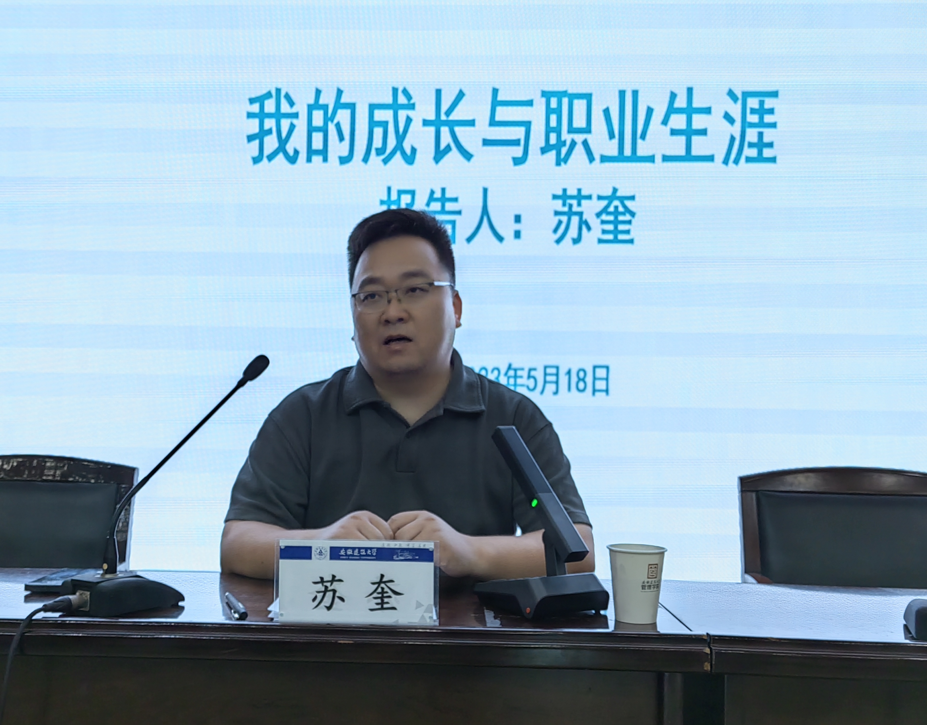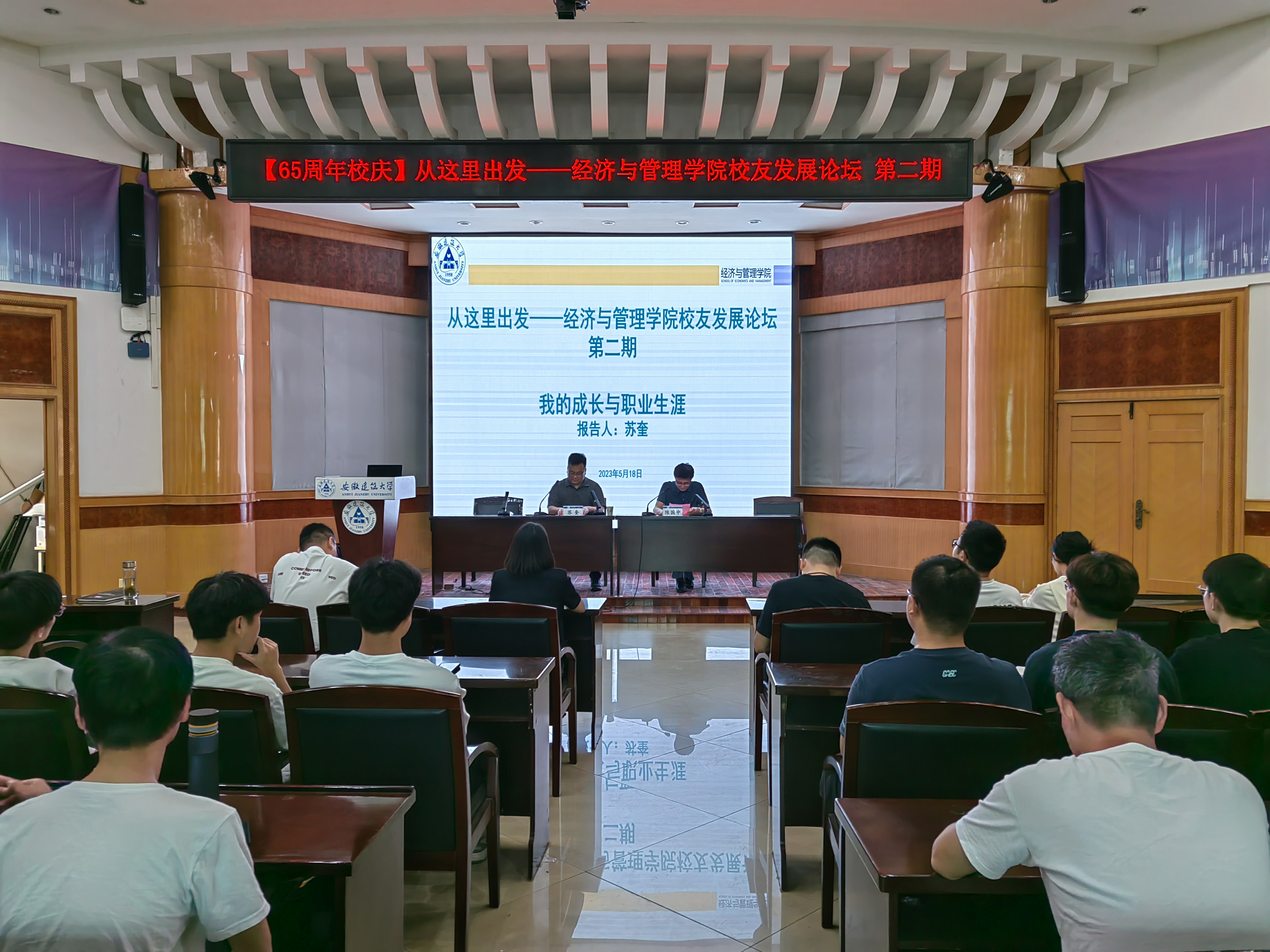 本网讯 为凝聚校友力量,讲好校友故事,充分发挥优秀校友的传承引领作用,5月18日,经管学院在北校区F楼三楼报告厅举办第二期校友发展论坛。本期论坛邀请到经管学院2003级工程管理专业校友、安徽建鑫工程咨询有限公司总经理苏奎作专题分享,学院领导班子成员、教师代表、各年级学生代表参会。