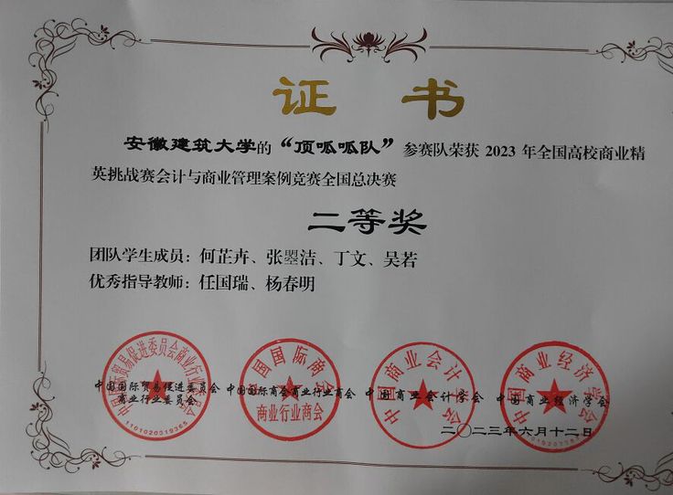 全国高校商业精英挑战赛会计与商业管理案例竞赛是纳入2023年3月中国高等教育学会高校竞赛评估与管理体系研究工作组发布的《全国普通高校大学生竞赛分析报告》大学生学科竞赛榜单的重要国内赛事。本届竞赛共有来自全国27个省、自治区、直辖市的400余所高等院校的3000多支参赛队报名参赛。通过层层选拔,由本届赛事自4月份个人赛开始,历经5月份安徽省省赛,六月份全国赛,我校学子在指导教师的精心指导下,通过多轮打磨参赛作品、精心设计并录制视频、模拟演练现场答辩等环节,最终从3000多支参赛队中脱脱颖而出,首次组队参加本项赛事即荣获全国二等奖。