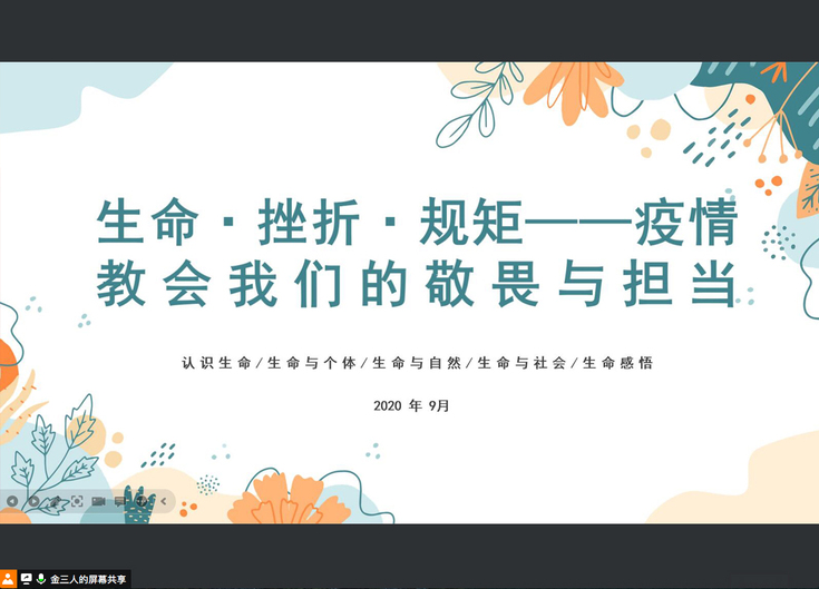 班会上,辅导员老师分别从认识生命、生命与个体、生命与自然、生命与社会和生命感悟等五个方面进行线上统一讲解,引导学生倾听、思考、观察、探索和接纳自我,调整和改善与他人的关系,从深层次上引导学生尊重生命、敬畏生命、感恩生命,帮助学生认识到挫折在人生中的不可避免性,从而提高学生的心理品质,促进学生健康成长。