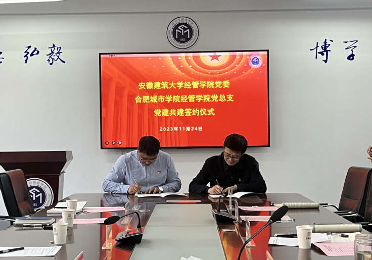 本网讯 为深入学习贯彻习近平新时代中国特色社会主义思想,以共建促党建、以党建促发展,充分发挥基层党组织的战斗堡垒作用,11月25日下午,经管学院党委与合肥市城建学院经管学院党总支在北区F楼404会议室开展党建共建活动。合肥市城建学院经管学院党总支书记周世敏,组织员、教工党支部书记张荣荣,学生支部书记吴园元、马招弟、刘玉林、奚翠萍,经管学院党政领导班子、学生党支部书记代表参加活动。