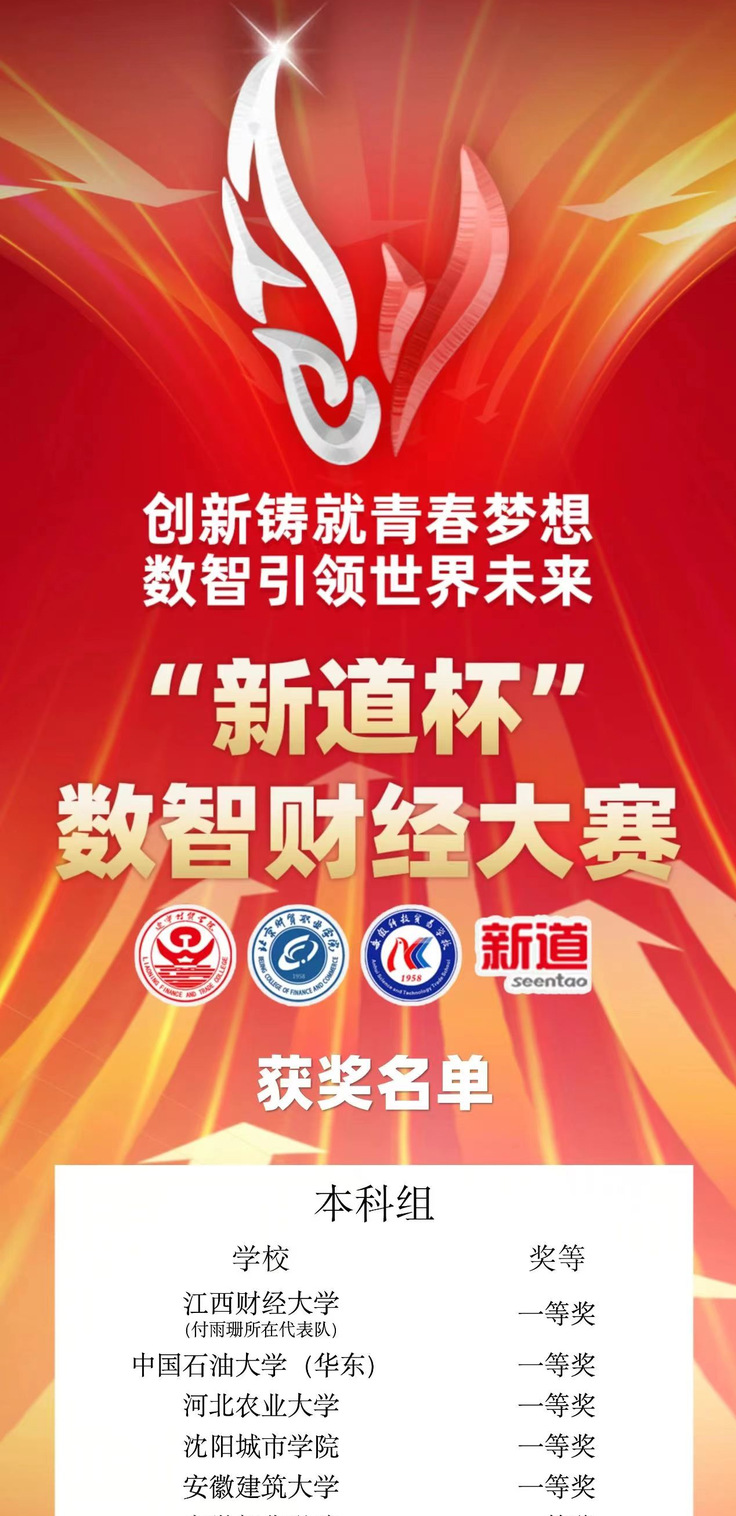 本网讯 近日,由中国商业会计学会和新道科技股份有限公司联合举办的2023“新道杯”数智财经大赛全国赛圆满落下帷幕。经管学院张立洋、周虹彤、余青阳、吴晶晶团队从全国一千多支队伍中脱颖而出,最终获得全国排名第五的好成绩并荣获一等奖。