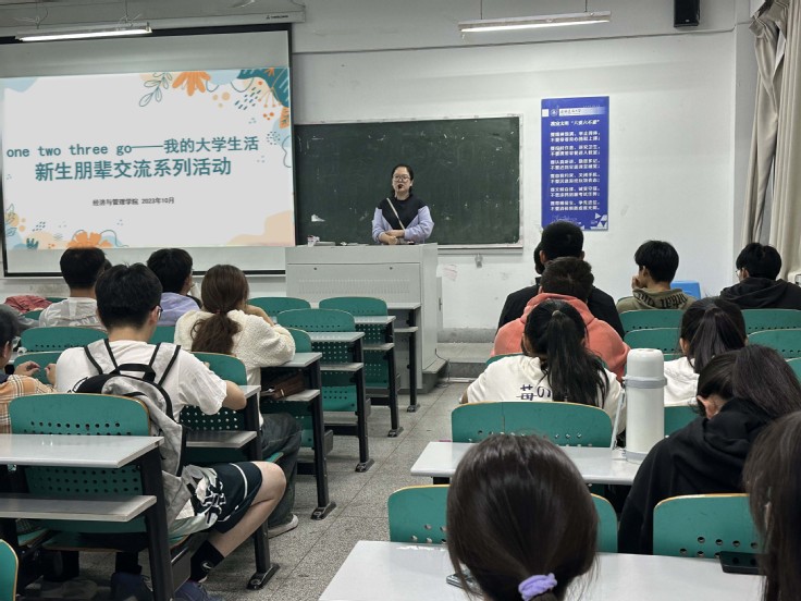 本网讯 为充分发挥高年级优秀学生的示范引领作用,帮助新生适应大学生活,扣好进入大学的“第一粒扣子”,10月31日,经管学院在F304教室召开“one two three go——我的大学生活”新生朋辈交流活动。