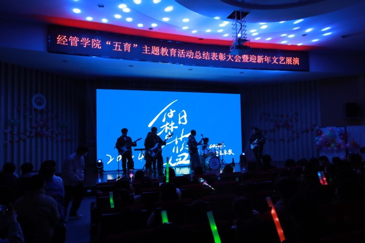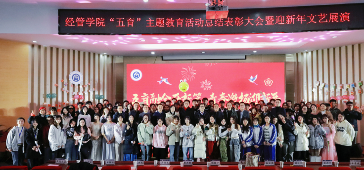 本网讯 为落实立德树人根本任务,持续深耕“五育融合”育人模式,营造高品位校园文化。12月28日,经管学院在北校区图书馆报告厅举办“五育”主题教育活动总结表彰大会暨迎新年文艺展演。学院领导班子、教师代表、优秀校友代表亲临现场与250余名学生代表欢聚一堂。此外,1000多名在校生和各届校友通过学院官方抖音号观看了活动直播。