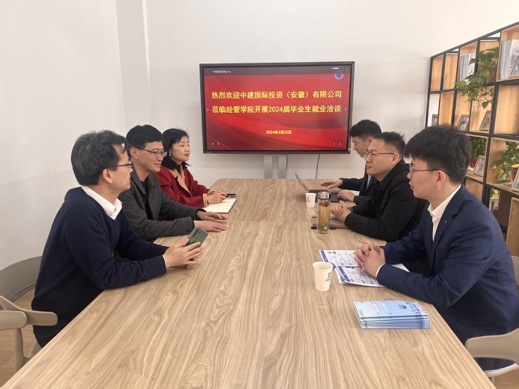 本网讯 为拓宽毕业生就业渠道,3月22日,中建国际投资(安徽)有限公司应经管学院邀请在建树楼305(西)会议室洽谈人才招聘工作。学院党政领导和相关毕业班辅导员参加洽谈。