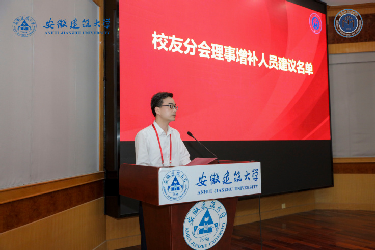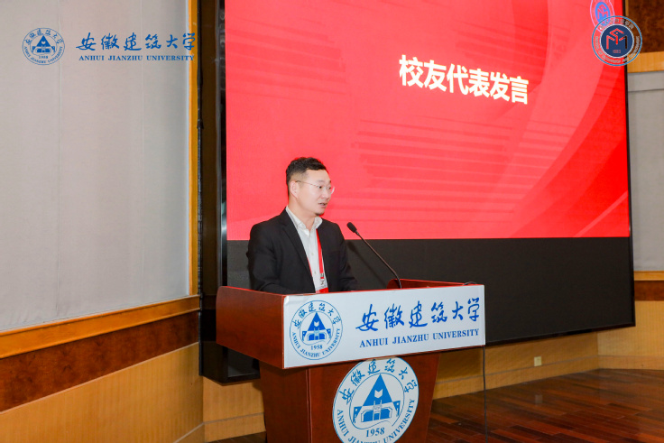 学院2000级工程管理专业校友、北京东方雨虹防水技术股份有限公司新品事业部浙江区域总经理潘波作为校友代表进行发言。他表示本次活动搭建了校友间增进友谊、反哺母校、回报社会的平台,加强了校友之间及校友和母校之间的联系,希望借助校友分会平台汇聚更广泛的校友资源,以更强大的力量助力学校各项事业发展,为建设国内一流、特色鲜明的高水平建筑大学贡献力量。