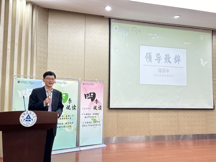学院党委书记陈国中致辞,他从“一起四季悦读”“擦亮四季阅读”“办好四季悦读”“支持四季悦读”四个方面表达对系列活动的期许,呼吁同学们积极参与活动,让阅读成为一种生活习惯、一种精神追求、一种社会风尚,在阅读中传递书香,赓续文明。他表示同学们要养成爱读书、读好书、善读书的良好习惯,要坚持守正创新,将四季阅读品牌传承好,为进一步助力校风、学风建设贡献经管力量。