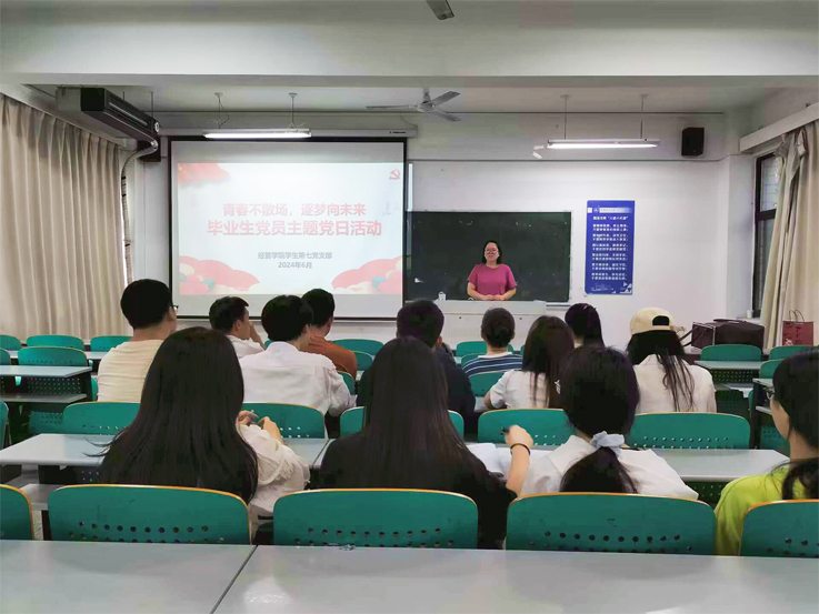 本网讯 为进一步加强毕业生党员理想信念教育,激励广大党员坚守初心、勇担使命,以良好的精神风貌踏入新的征程,6月15日,经管学院学生第七党支部在建树楼304教室开展“青春不散场,逐梦向未来”毕业生党员主题党日活动。