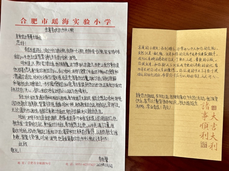 在信件交流的环节中,大学生与小学生围绕“阅读的奇妙世界”“书籍中的好朋友”“阅读的秘密花园”“我和书籍的小故事”“阅读,让梦想飞翔”等主题,认真书写并倾诉心声。小学生们的求知欲与好奇心如初升的“朝阳”,大学生们则如“灯塔”,引导着他们走向知识的广阔天地。通过提问与解答,双方在互动中激荡起智慧的火花,点燃了彼此的学习热情。