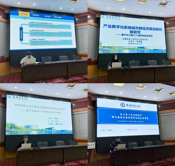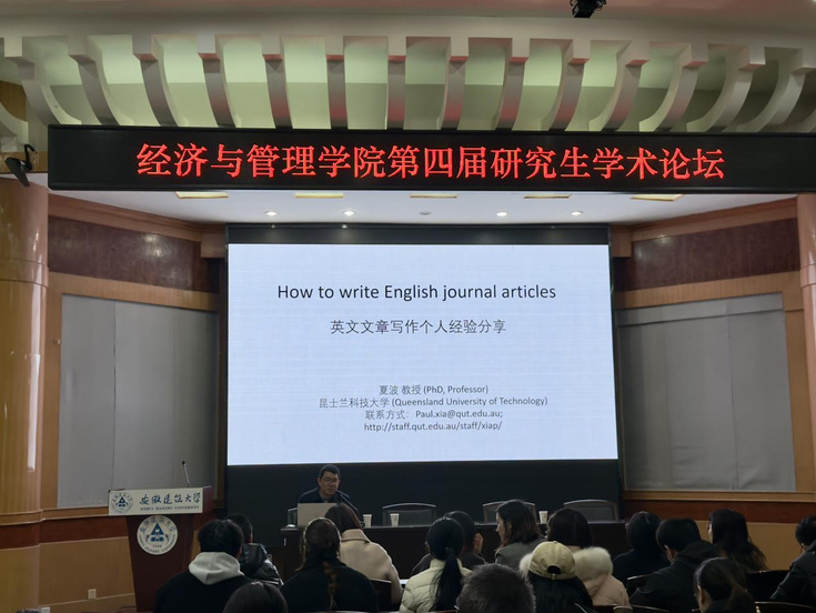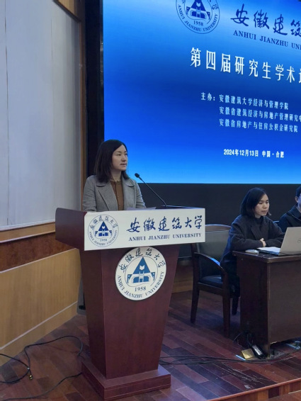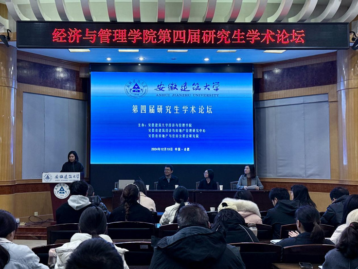 本网讯 12月13日,经管学院第四届研究生学术论坛在北区F南楼三楼报告厅顺利举行。本次论坛由安徽省建筑经济与房地产管理研究中心与安徽省房地产与住房公积金研究院联合主办,旨在为研究生搭建“交流创新思维、拓宽学术视野、激发创新热情”的学术平台。澳大利亚昆士兰科技大学夏波教授、Carol Hon副教授应邀作主题报告,学院领导班子成员、骨干教师、研究生共120余人参加了本次论坛,论坛由经管学院数字经济硕士点负责人孙伟教授主持。