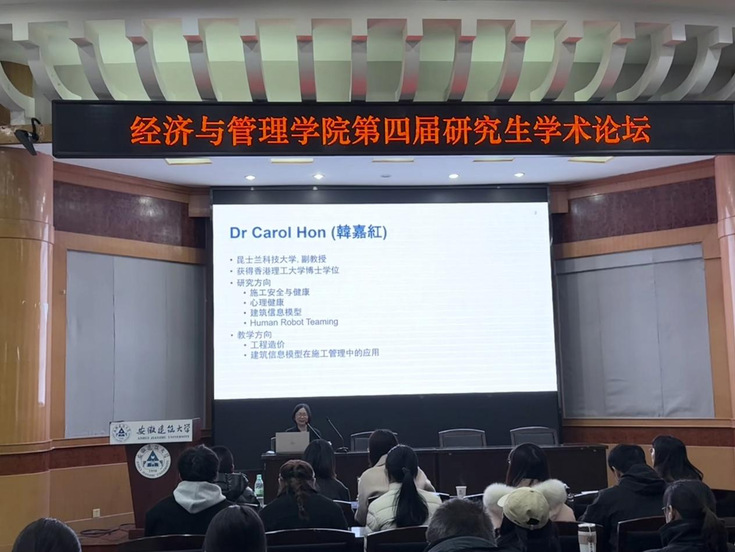 上午为专家讲坛部分。昆士兰科技大学夏波教授以“英文文章写作个人经验分享”为主题进行报告,为经管学院师生详细介绍了英文论文主要结构与撰写技巧,并提出一篇论文仅需解决一个研究目标、熟能生巧、早写早投等写作建议。Carol Hon副教授以“Improving the mental health of theconstruction workers(改善建筑工人的心理健康研究)”为主题进行报告,以建筑工人的心理健康为背景,系统介绍了其在该领域的主要研究成果,并提出在未来的城市建设管理研究当中,不应仅关注建设行业从业者安全问题,更多的是要关注人的心理健康。最后,同学们与主讲嘉宾就相关问题进行了深入探讨和热烈交流,现场气氛十分活跃。